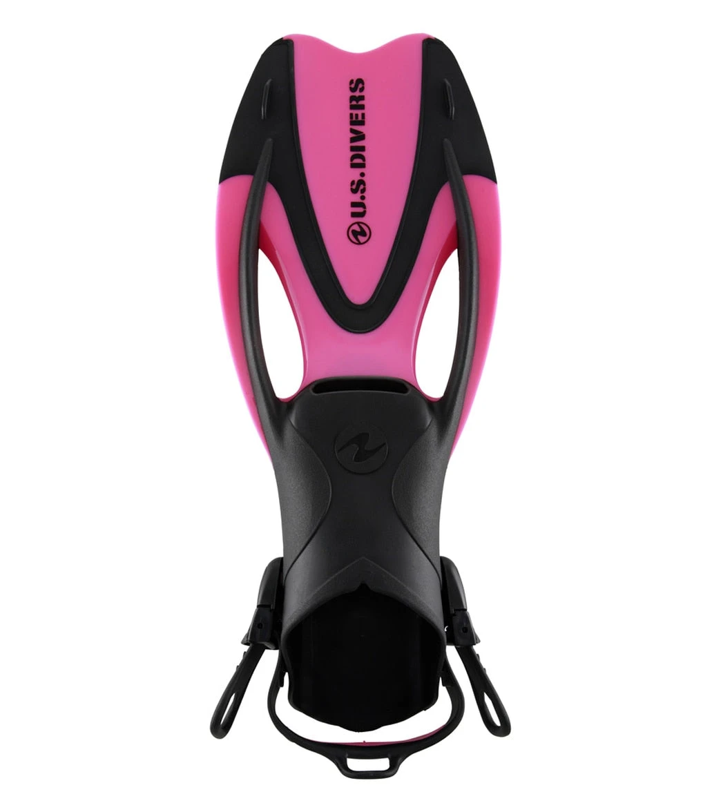 With bright, striking colors and quality features, the U.S. Divers Dorado Jr II Mask, Fins and Snorkel Set lets your kids explore the beach shallows in style. The Dorado Jr snorkeling mask features a dual-window, polycarbonate design with anti-fog treated lenses for ultra-clear vision. A split strap and easy-to-adjust buckles provide a comfortable, leak-free seal. The Seabreeze snorkel has a hydro-adhesion top designed to keep splashed surface water out of the snorkel. Proflex FX Jr fins are vented and flex with the kick, providing power while reducing foot and ankle fatigue for all-day snorkeling adventures.