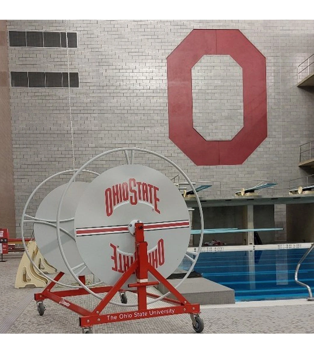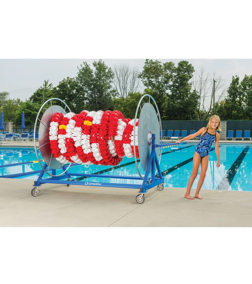 Competitor’s new, high-capacity Elite Stor Lane Reel Standard Customization™ is ideal for easy, mobile storage and installation of racing lanes. Solid end-wheels keep lines safely on the core to avoid tangles and line damage. Powder-coated aluminum frame and end-wheels offer durability for both indoor and outdoor use. A unique, end-mounted tow handle and 6-inch stainless steel casters with individual brakes provide easy and safe maneuverability. Available in dark Competitor blue.