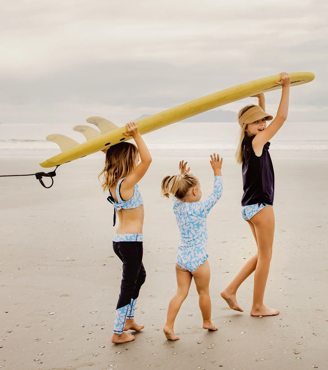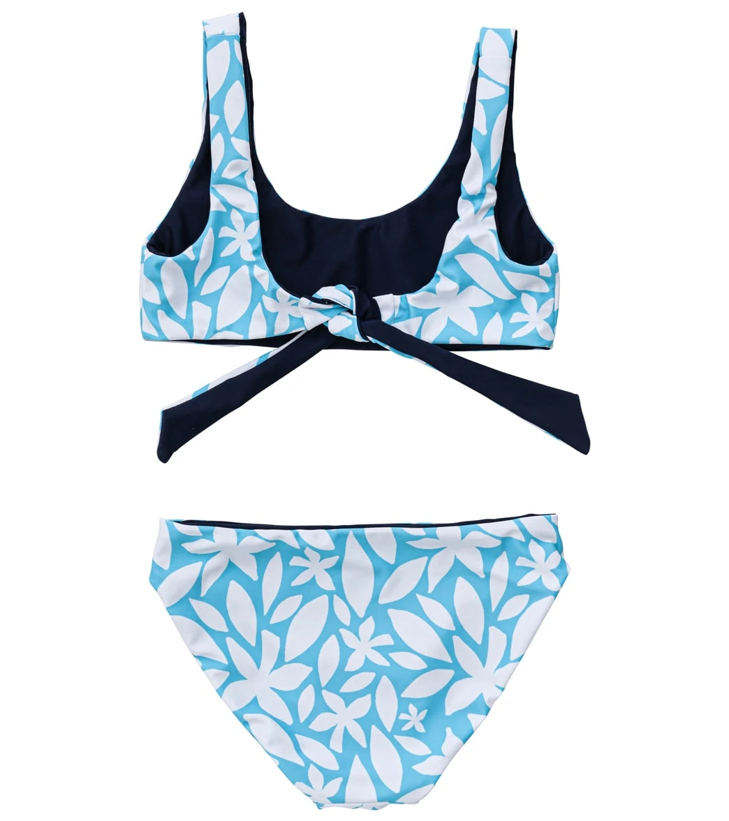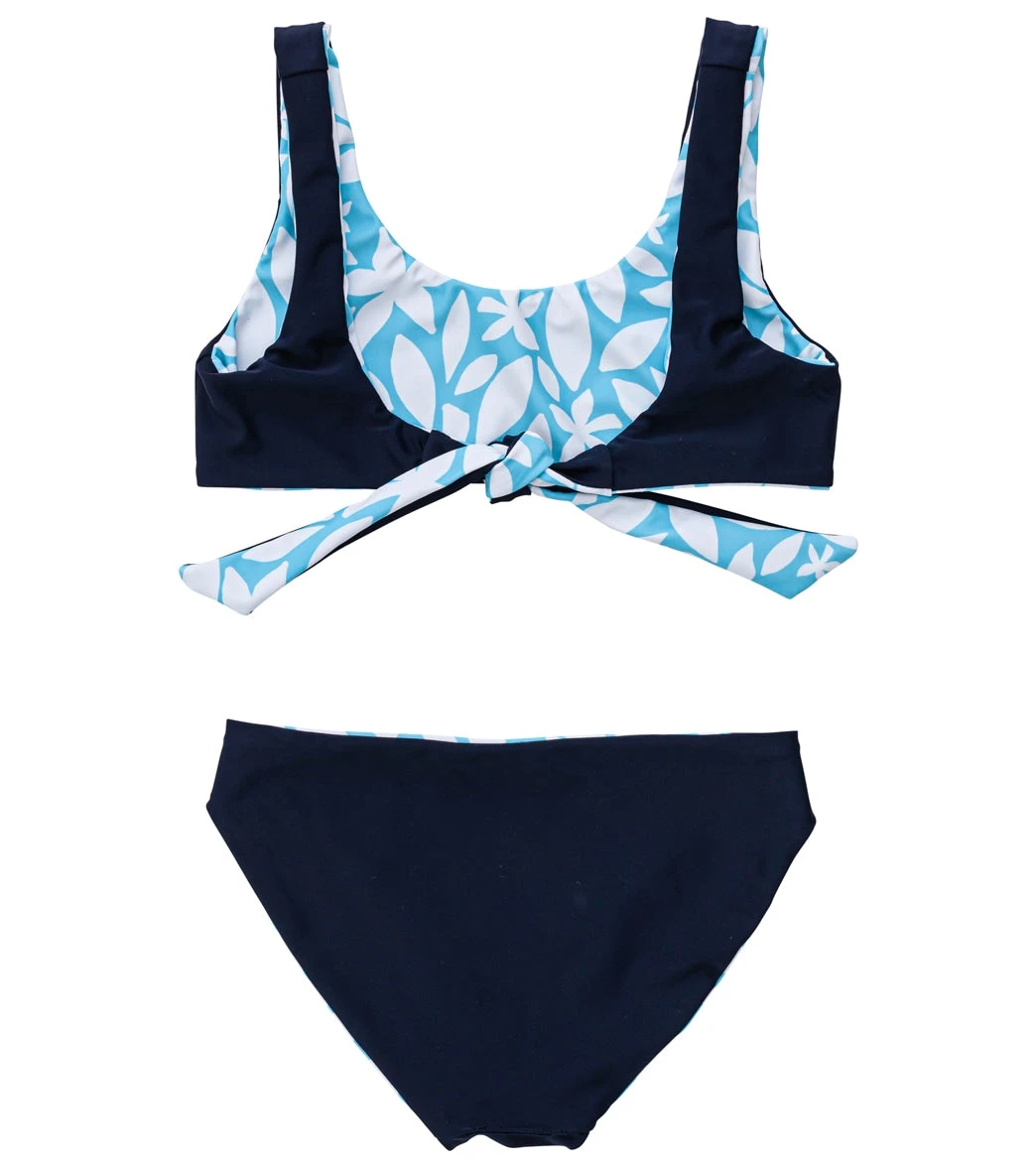 Surf, sun and fun! The Aqua Bloom Reversible Surf Bow Bikini is ready to hit the beach. Both the top and bottom are reversible, with The Aqua Bloom print on one side and deep navy on the reverse. Made from ECONYL regenerated nylon fabric, helping to clean up The oceans from fishing waste.A tween and teen favorite.