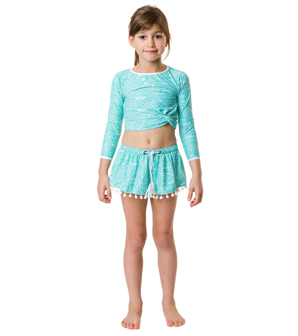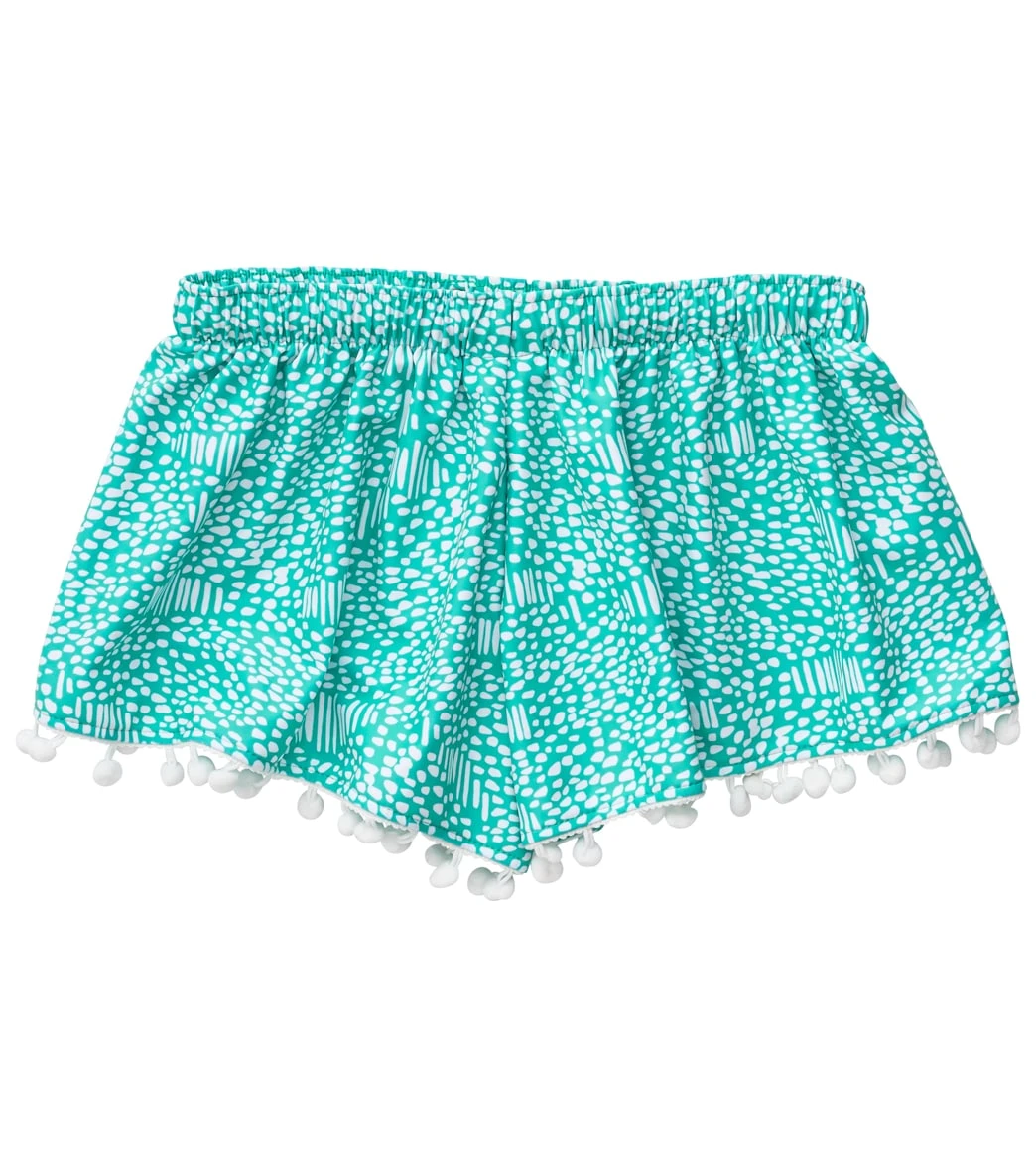 Rock pool and sea shore exploring are perfect in The Spearmint Spot Swim Shorts. Featuring The minty fresh Spearmint Spot print, and white pom pom trim details.