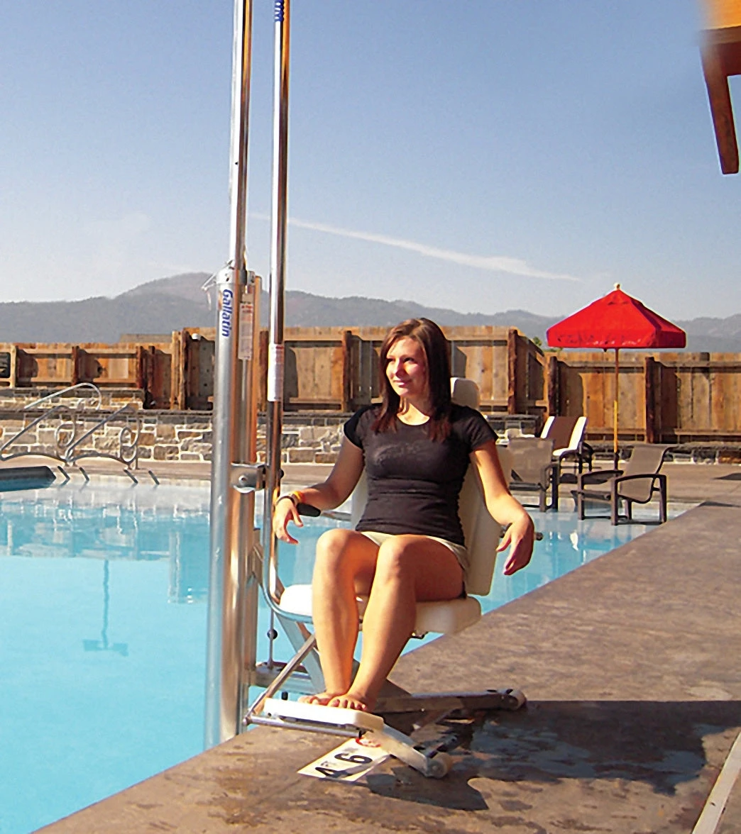 - Water-Powered Lift Benefits:    – ADA and Title 24 Compliant.    – Minimum 400 lb lifting capacity.    – Powered by large diameter cylinder and piston for faster and more powerful lifting capacity.    – Made from all stainless steel construction (304L Grade).    – Coated with SpectraShield® for maximum corrosion protection.    – Self operable from deck and water with waterproof remote control.    – Spacious seat with excellent lumbar support.    – Designed for ease of transport with built-in wheels for portability.    – Runs on standard 55 psi water pressure.    – Quiet and stable operations.    – Designed for in-ground and above-ground pools and spas.    – Base stand design that accommodates high loading capacity with minimal deflection.